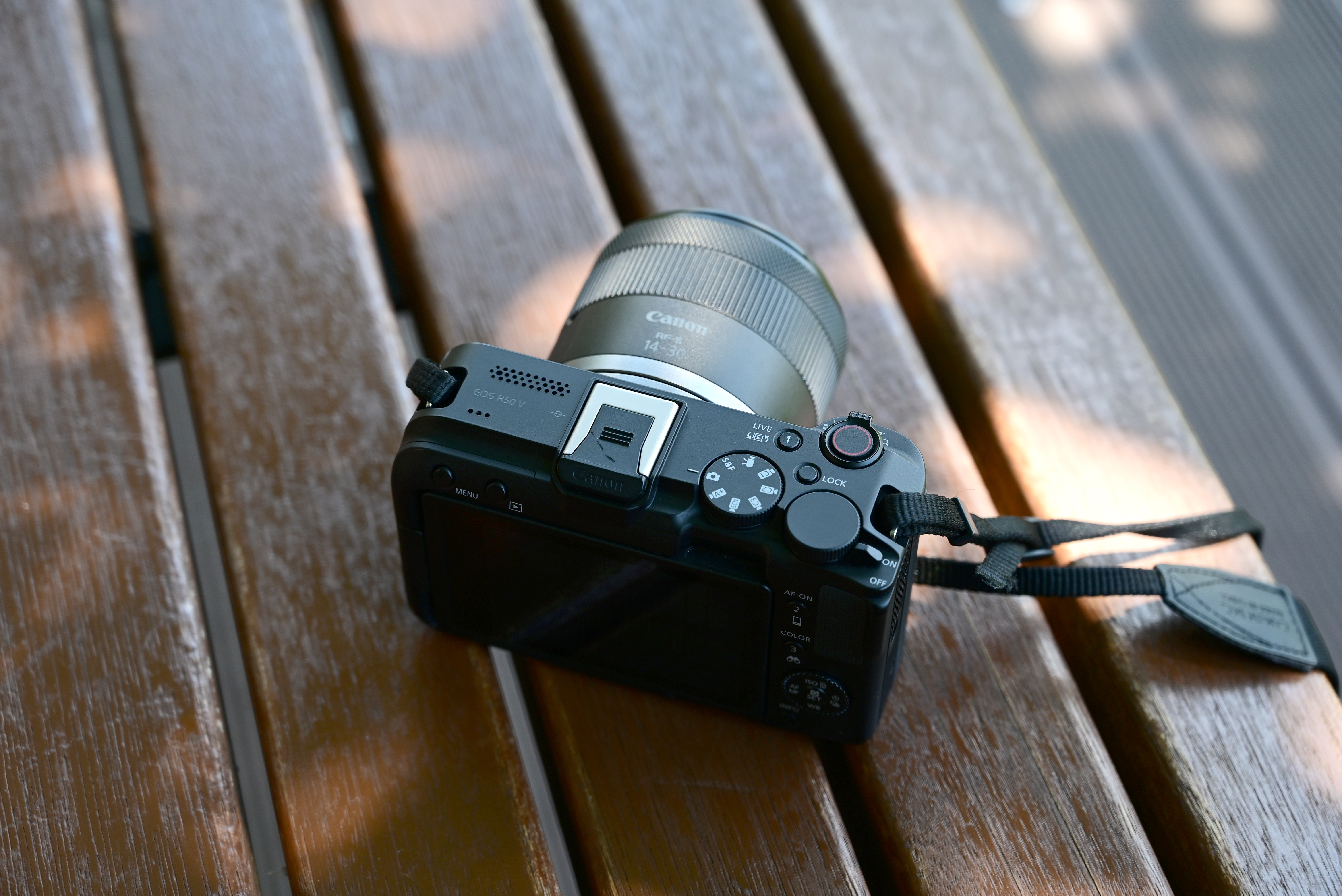 직접 케논 EOS R50 V를 잠시 사용해 보며 가장 먼저 느낀 점은 정말 가볍고 손에 쏙 들어온다는 점이었습니다. 바디 크기는 약 116.3mm × 85.5mm × 68.8mm로 아담한 편인데 그립부가 탄탄하게 설계되어 있어 한 손으로도 안정적인 촬영이 가능했습니다.