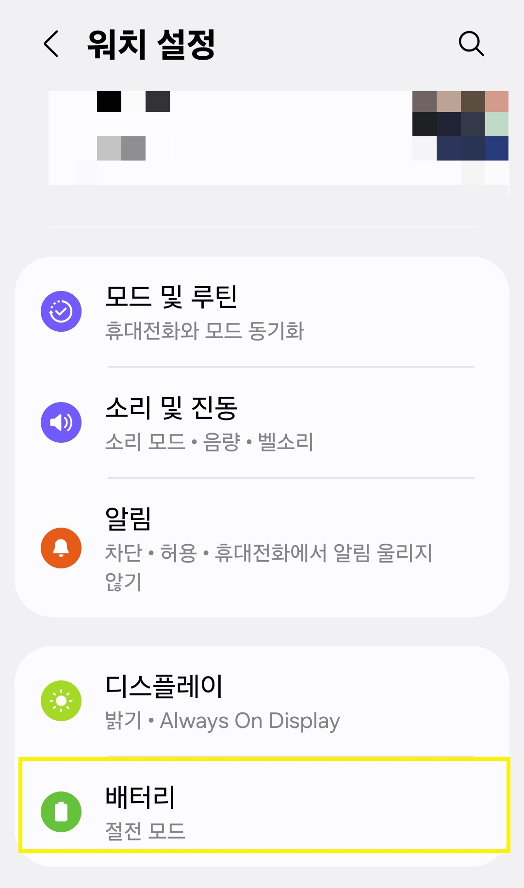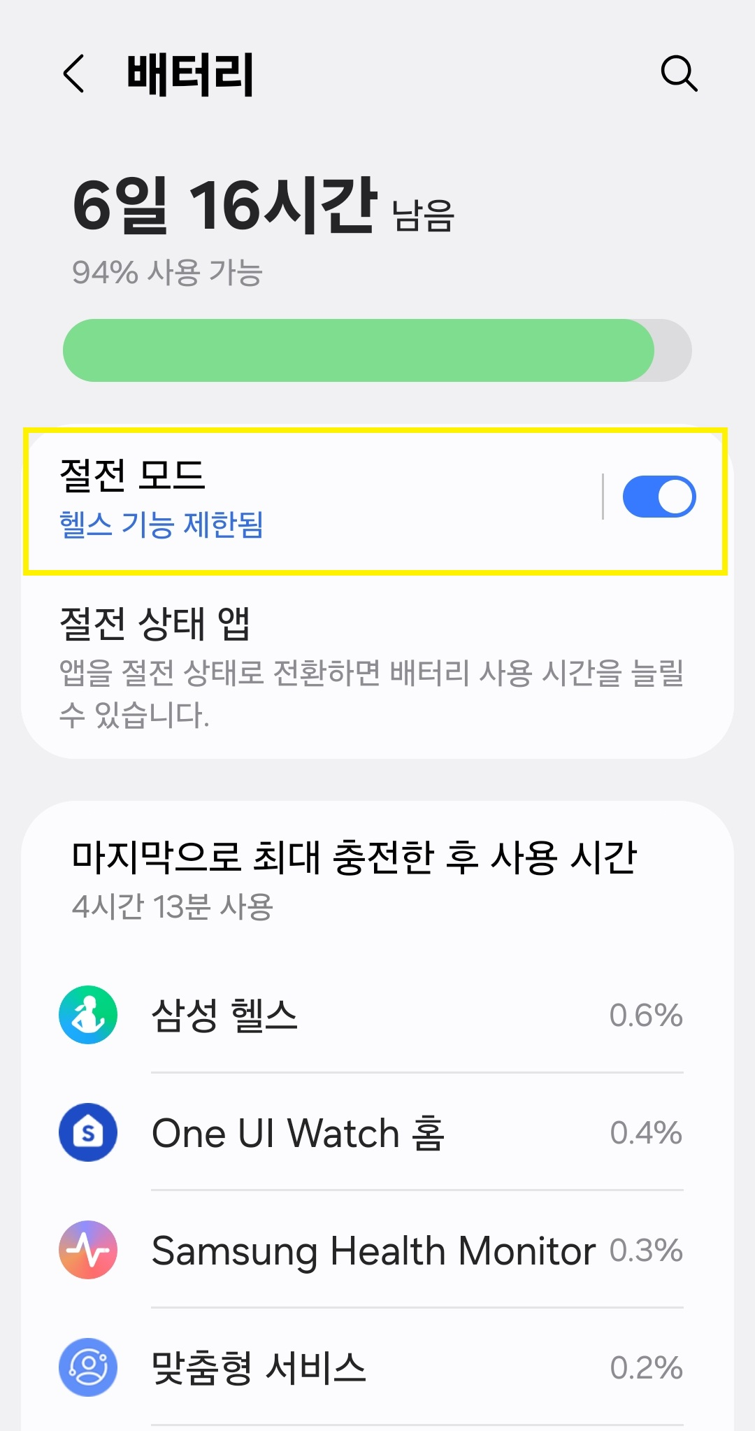 설정 경로 : Galaxy Wearable 앱 → 워치 설정 → 배터리 → 절전 모드