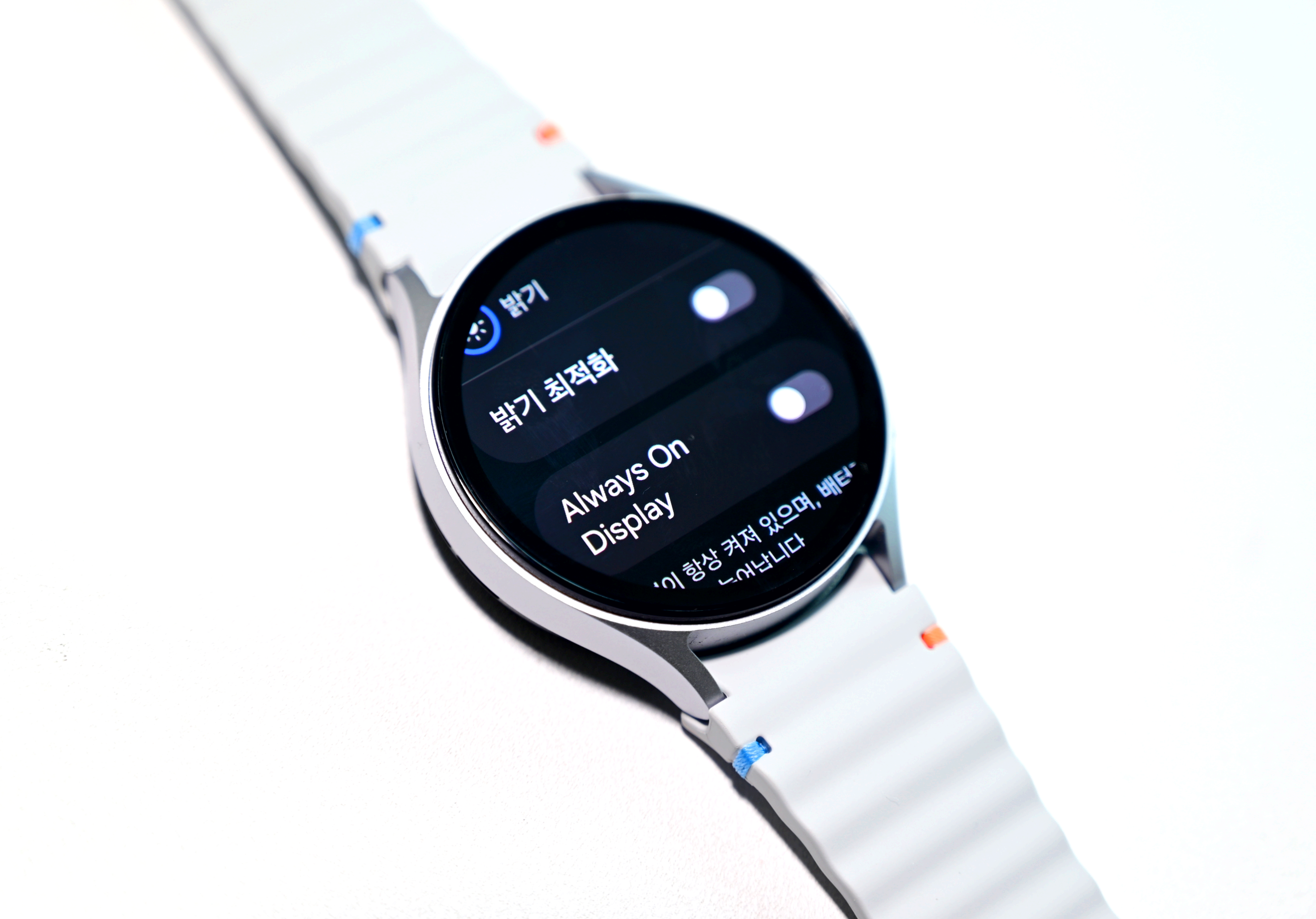 디스플레이는 워치에서 가장 많은 전력을 소비하는 부품입니다. 설정 → 디스플레이에서 먼저 Always-On Display를 껐습니다. 시계 화면이 항상 켜져 있는 건 멋있지만 배터리를 잡아먹는 주범이더군요. 그 대신 손목 올려 켜기 기능을 켜서 필요할 때만 화면이 켜지도록 했습니다.