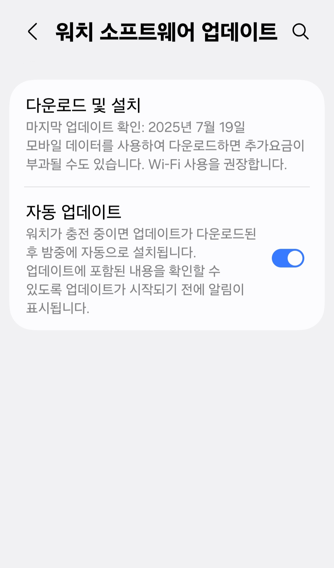 마지막으로 Galaxy Wearable 앱 → 워치 소프트웨어 업데이트에서 최신 버전을 항상 유지하고 있어야 합니다. 펌웨어 업데이트는 단순히 새로운 기능을 추가하는 것이 아니라 배터리 효율 개선과 버그 수정도 포함되어 있죠. 실제로 업데이트 이후 배터리 소모가 줄어든 경험을 여러 번 했었습니다. 최신 상태를 유지하는 건 장기적으로도 배터리 관리에 중요한 습관입니다.