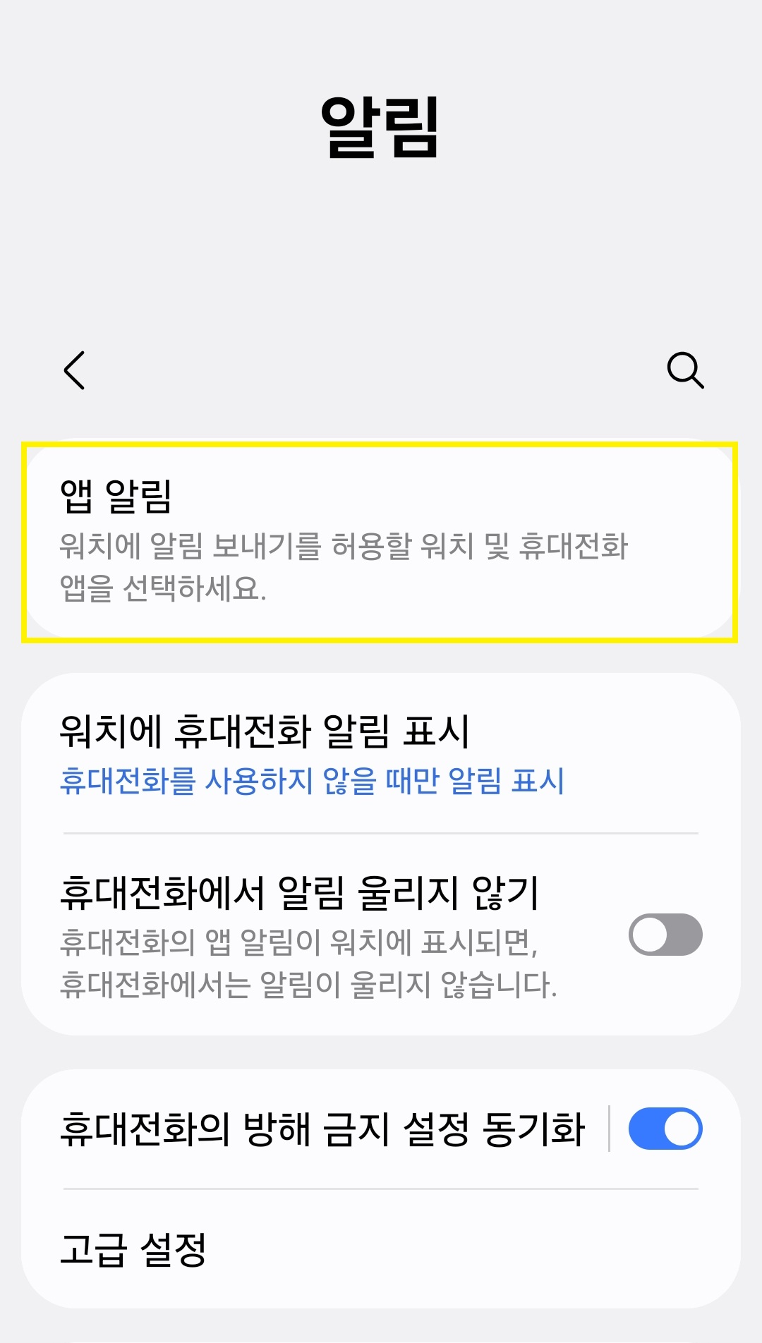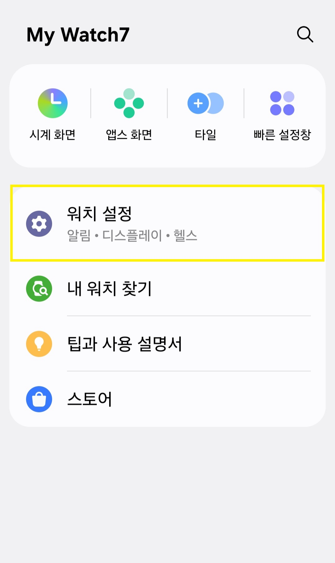 설정 경로 : 워치 설정 → 알림 → 앱 알림, 설정 → 삼성 헬스
