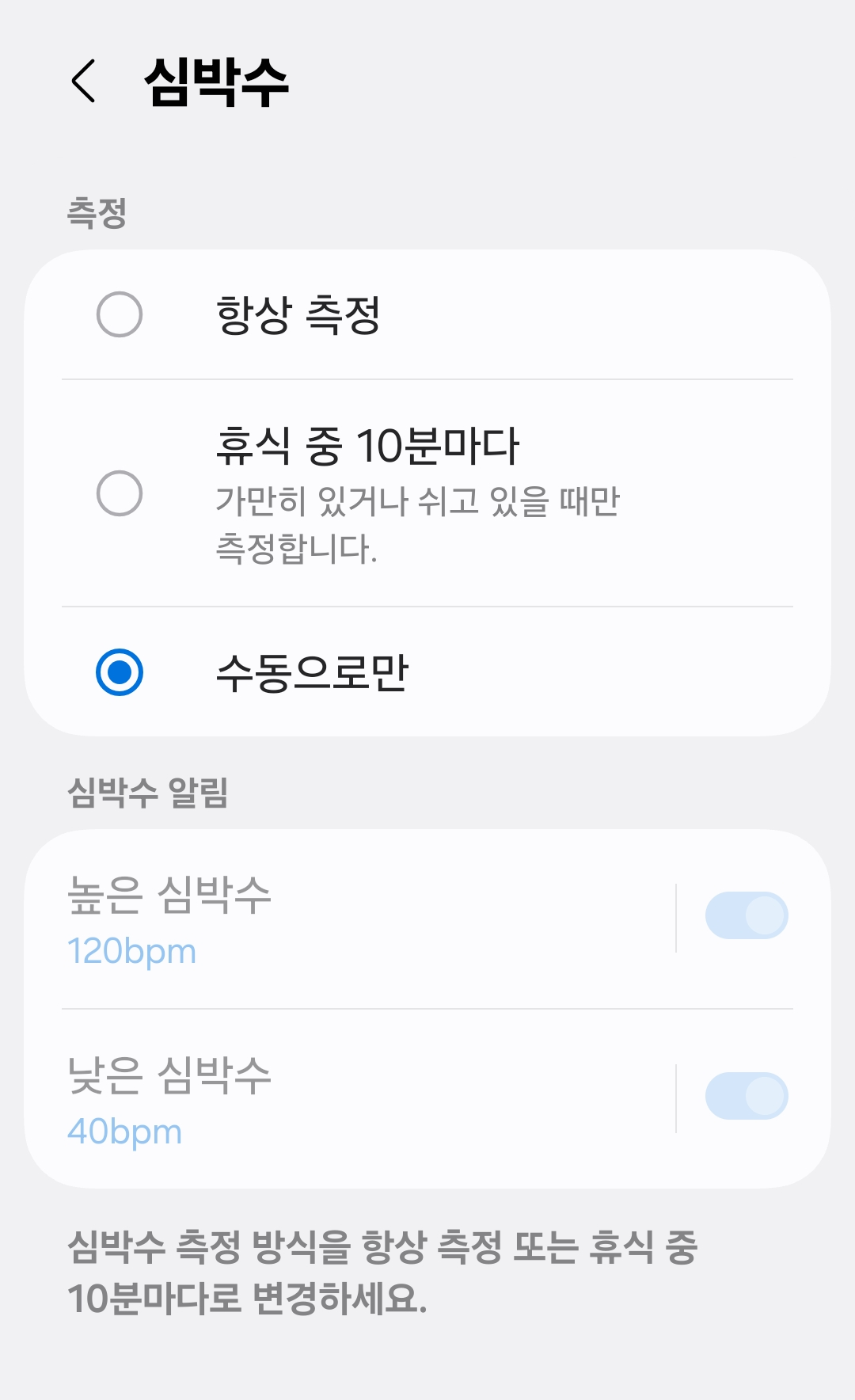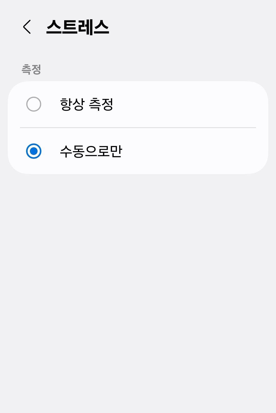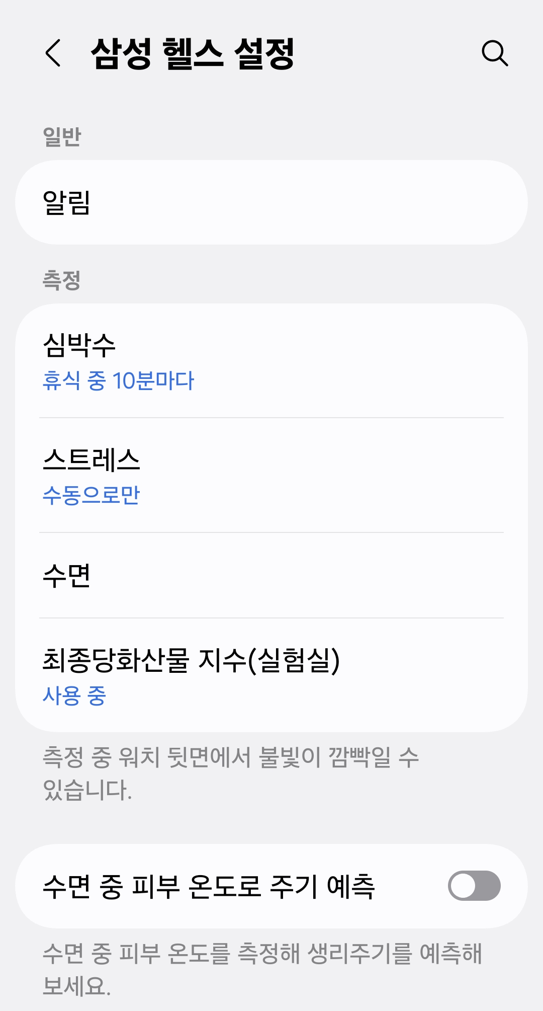 그리고 워치 설정 → 삼성 헬스에 들어가 심박수, 스트레스, 수면 자동 측정을 모두 수동으로 변경했습니다. 이렇게 하니 밤새 충전하지 않고도 배터리가 훨씬 여유 있었습니다.